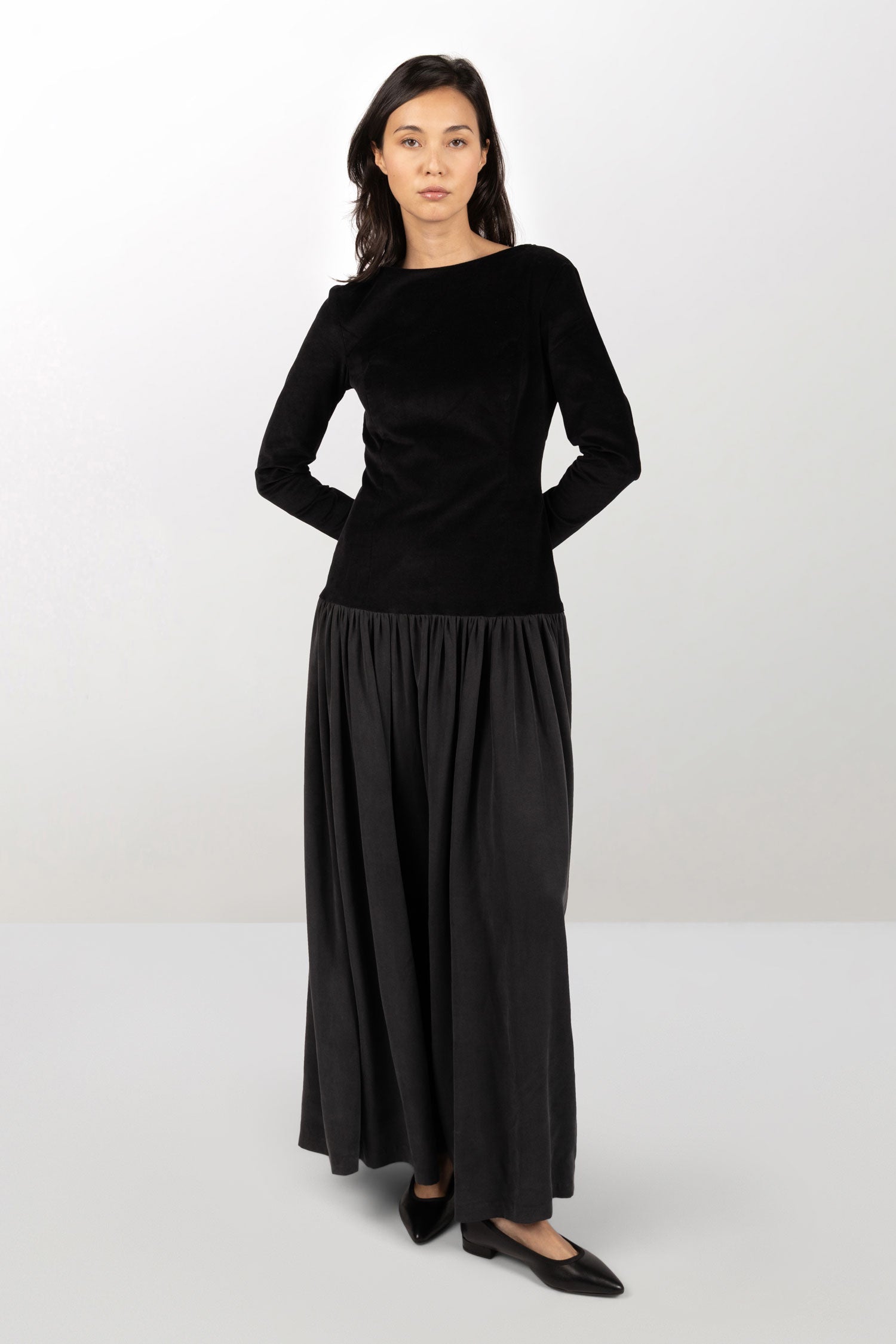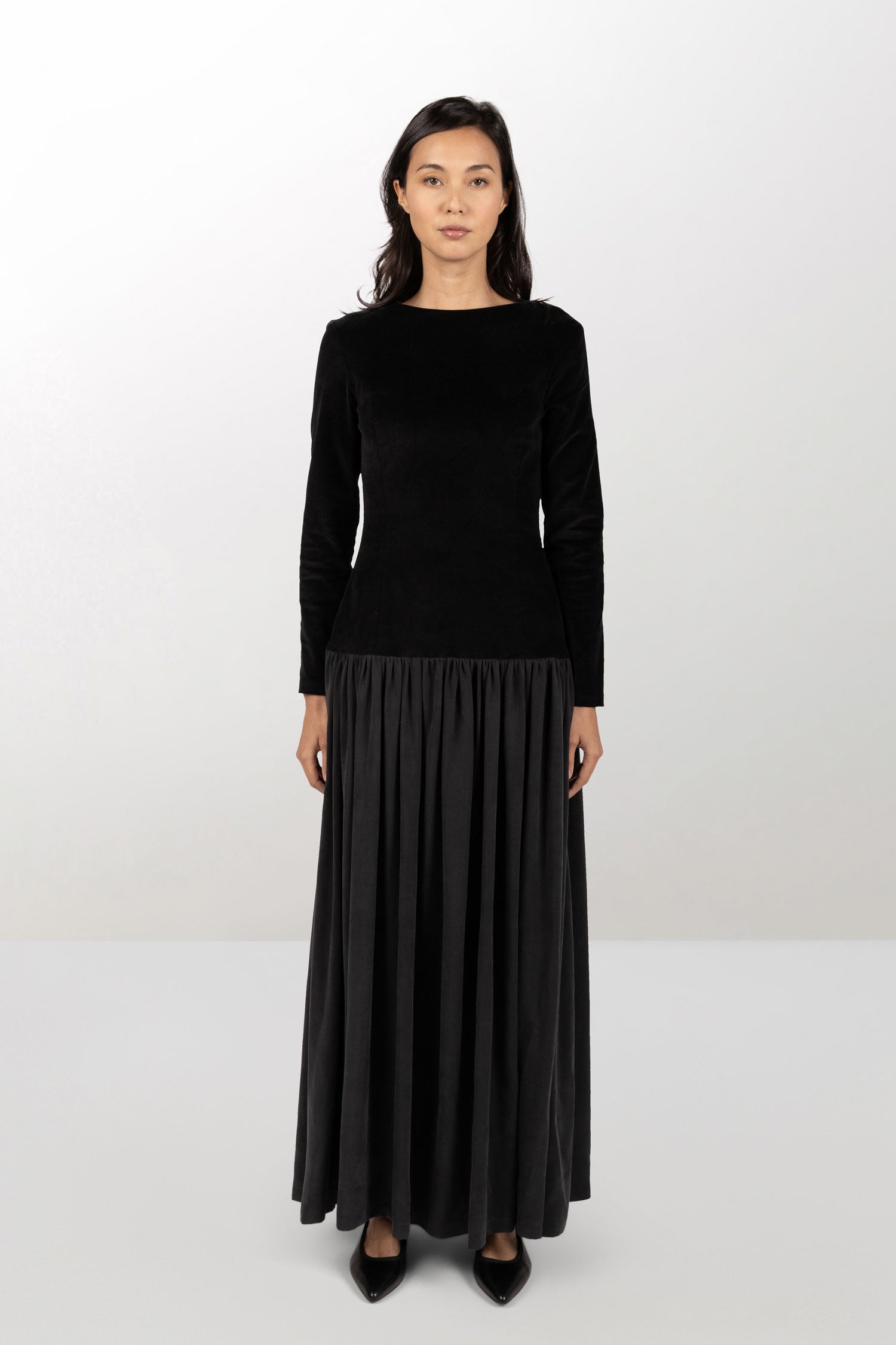 Long dress with boat neckline and long sleeves. Zip fastening at the back. Bodice in black stretch velvet and pleated skirt in washed silk-effect tencel. Bodice lined with printed cotton.