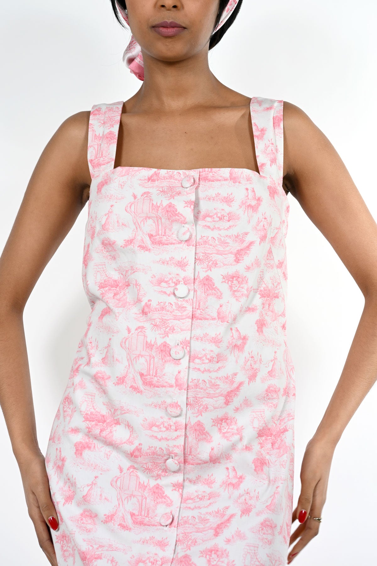 Long buttoned dress with straps in organic cotton. Covered buttons. Full coton lining. Pink Toile de Jouy pattern.