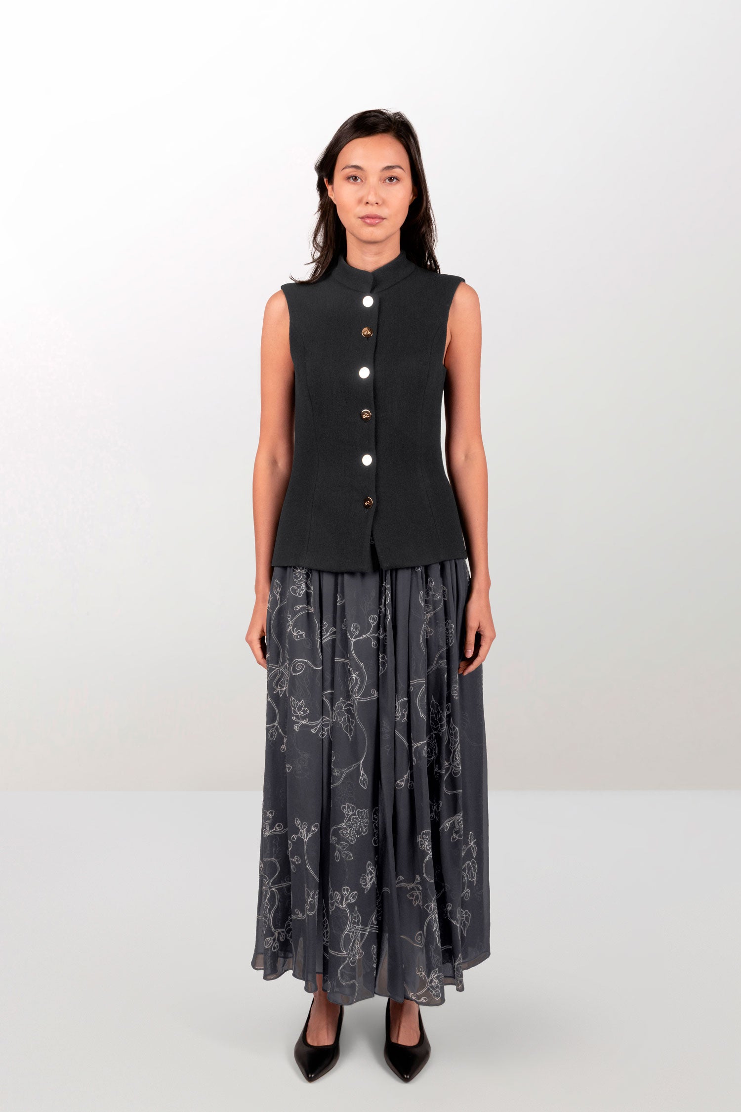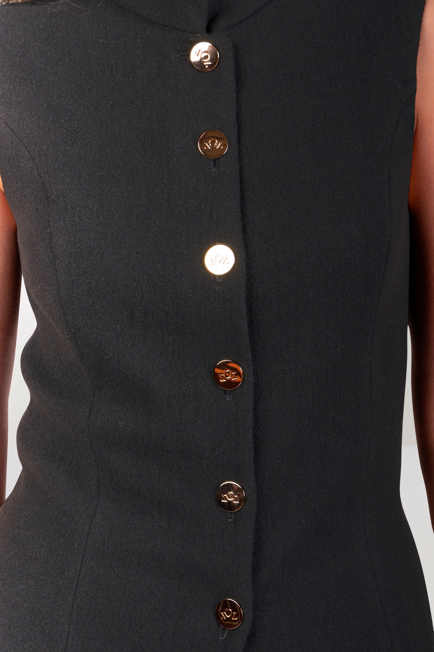 Sleeveless wool jacket. The jacket is buttoned at the front and lined with cotton voile. Monogrammed metal buttons.